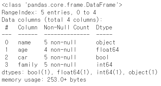 df.info() #Range Index : 5 entries, 0 to 4 => 5개의 행이 있으며 인덱스는 0부터 4이다 #Data columns (total 4 columns) => 데이터 열(컬럼)은 총 4개 있다 #Column => 컬럼 이름 #Non-Null Count => Nan이 아닌 값의 수 #Dtype => 데이터 타입 종류