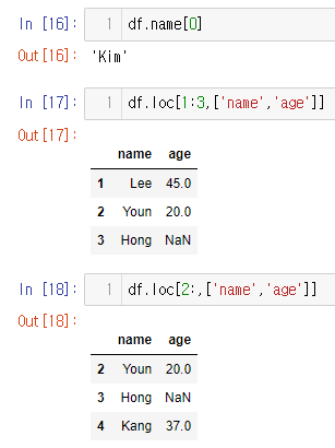 # 하나의 행만 불러오기 df.name[0] # 인덱스 1~3 불러오기 df.loc[1:3,['name','age']] # 인덱스 2부터 끝까지 불러오기 df.loc[2:,['name','age']]