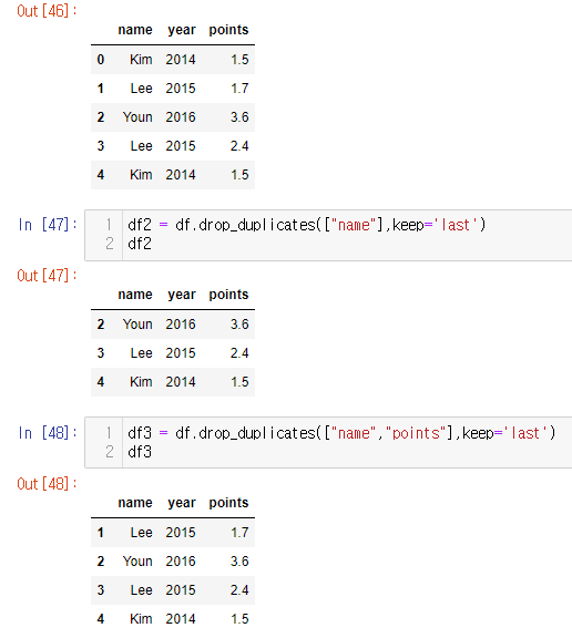# 한개의 컬럼(name)이 중복일 경우 삭제 df2 = df.drop_duplicates(["name"],keep='last') # 두개의 컬럼(name, points) 모두 중복일 경우 삭제 df3 = df.drop_duplicates(["name","points"],keep='last')