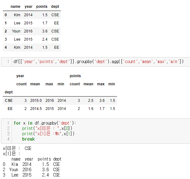 dic = { "name": ["Kim", "Lee", "Youn", "Lee", "Kim"], "year": [2014, 2015, 2016, 2015, 2014], "points": [1.5, 1.7, 3.6, 2.4, 1.5], "dept" : ["CSE", "EE", "CSE", "CSE", "EE"] } df = pd.DataFrame(dic) print(df) # 각 그룹에 대해서 통계치를 반환 df[['year','points','dept']].groupby('dept').agg(['count','mean','max','min']) # groupby를 for문에서 받을 경우 for x in df.groupby('dept'): print("x[0]은 : ",x[0]) print("x[1]은 :\n",x[1]) break
