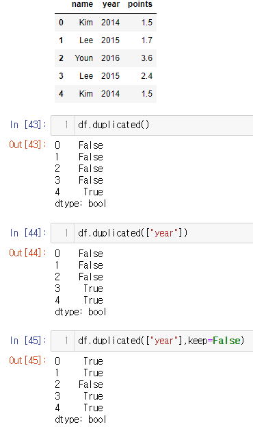 # 데이터 생성 dic = { "name": ["Kim", "Lee", "Youn", "Lee", "Kim"], "year": [2014, 2015, 2016, 2015, 2014], "points": [1.5, 1.7, 3.6, 2.4, 1.5] } df = pd.DataFrame(dic) # 전체 행의 중복 확인 df.duplicated() # year 컬럼의 중복 확인 df.duplicated(["year"]) df.duplicated(["year"],keep=False) # keep 인자의 기본값은 First # first : 후에 나타난 값을 중복으로 취급 # last : 먼저 나타난 값을 중복으로 취급 # False : 둘다 중복으로 취급