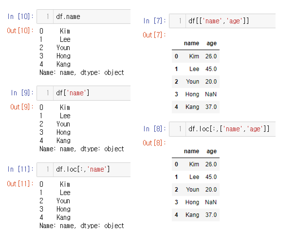 # 여러방법을 통해서 불러올 수 있다 df['name'] df.name df.loc[:,'name'] # 다중 열 선택 df[['name','age']] df.loc[:,['name','age']]